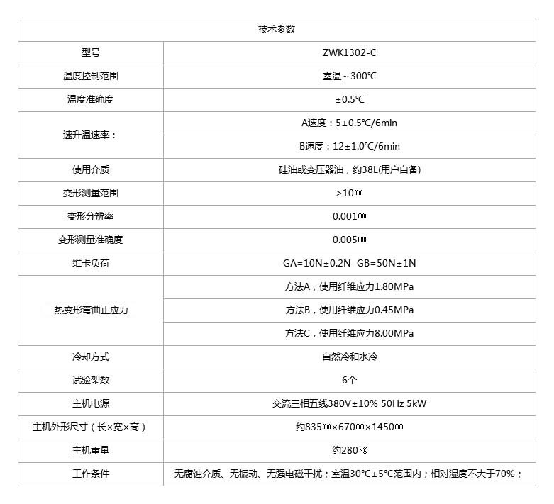 产品型号:ZWK1302-C 设备说明:ZWK1302-C微机控制热变形维卡软化点试验机用于检测热塑性塑料管材及管件的维卡软化温度及负荷变形温度的试验。该机主要传感器、执行元器件具有质量好、可靠性高、安全性高等优点,试样架能自动升降,同时配备的PowerTest试验软件是一款专用于测试维卡软化温度、负荷变形温度的软件。该机是一些塑料管材、管件生产厂家及质检单位等部门必不可少的检测仪器。 执行标准: