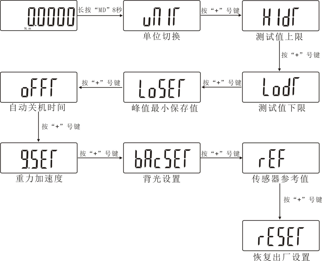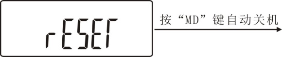(RESET)恢复出厂设置功能:在此设置项目下,按“MD”键即可恢复出厂设置,仪器自动关机,若使用机器重新开机即可。如下图所示: