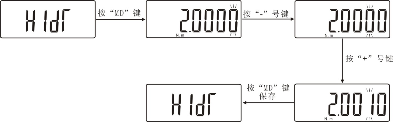 (HIDT)测试值上限设定:设定测试值上限。高于上限为超出范围,“MAX显示”,本仪器默认上限值为满量程。若想重新设定上限值,在此设置项目下,可用“+”和“-”键设定。按“MD”键保存后回到设置界面。如下图所示: