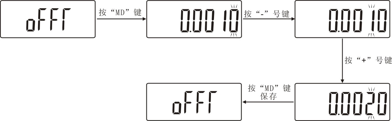 (OFFT)自动关机时间设定:本仪器默认自动关机时间为10分钟。在此设置项目下,用“+”和“-”键选择,可设定0分钟到99999分钟自动关机,也可设定“00000”不自动关机。如选不自动关机,选定后按“MD”键完成设定,返回到设置界面。如下图所示: