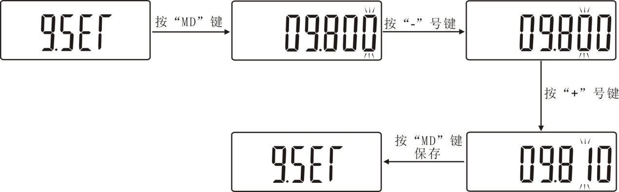 (G.SET)重力加速度设定:用户可根据本地区的位置设定重力加速度值,本仪器默认为09.800。在此设置项目下,可用“+”和“-”键设定重力加速度设定值。如下图所示: