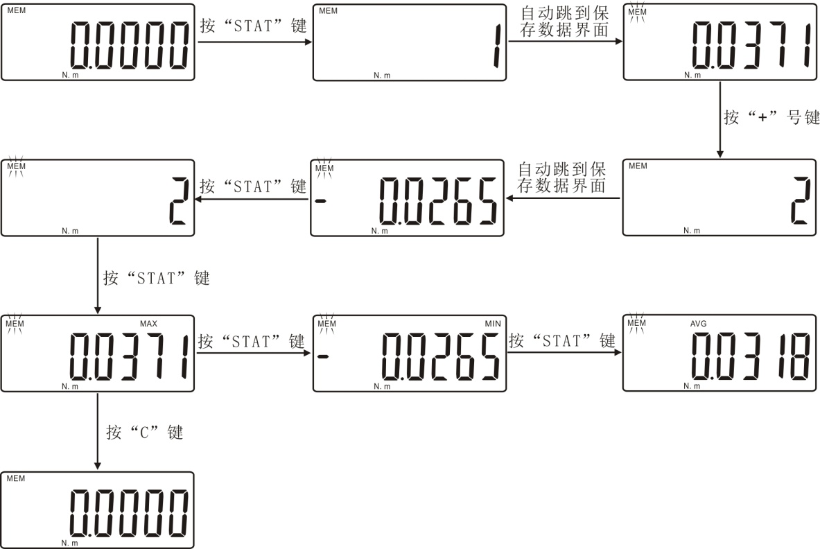 保存测量数据后按“STAT”键,屏幕出现“1”,表示存储的第一组数据,之后屏幕自动显示保存的数据;再按“+”键,屏幕出现“2”后自动显示保存的第二组数据;继续按“+”键,屏幕自动显示保存的第三组数据,再按“STAT”键,屏幕显示“3”,表示存储数据的总组数,再按“STAT”键就会显示保存数据总和的最大值,接着按“STAT”键,就会显示保存数值总和的最小值,再按“STAT”键,就会显示保存数值总和的平均值,之后可按“C”键返回到测量界面。如下图所示: