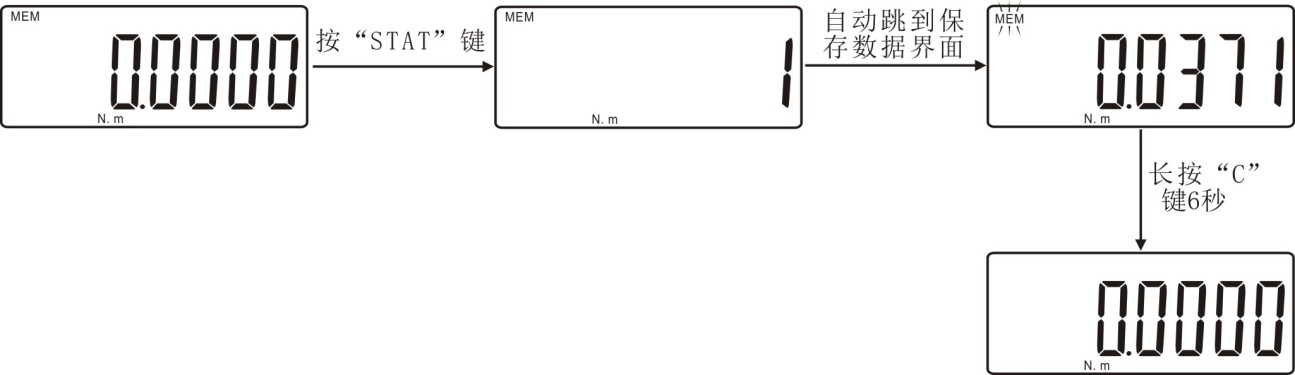 4.7 在扭矩起子发出“咔哒”声时,松开扭力。在实时模式下,按“STAT”键保存数据;在峰值模式下,松开扭力时会自动保存扭力(数值要大于峰值最小保存值),然后数值自动复位。