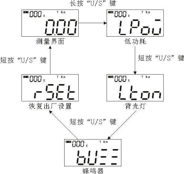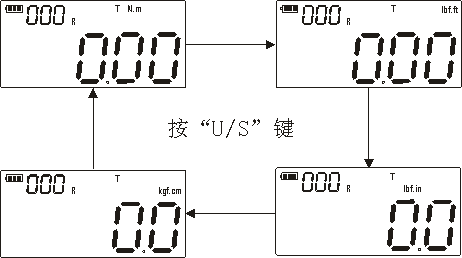 开机状态下,在使用界面非设置界面下,按“U/S”键,切换四种工程单位。