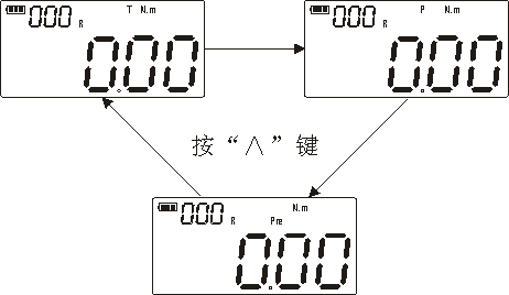 实时测量模式实时跟随施加扭力值,当卸载扭力时,扭力值自动归零。液晶屏显示为“T”时,为实时模式,请按“∧”键进行工作模式切换。