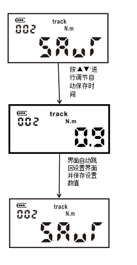 2、SAUT 峰值模式下自动保存数据时间设置,当设置为0时为手动保存(按MEM键保存),按上下键进行时间设置时间MAX为4秒,保存数据可保存100组。