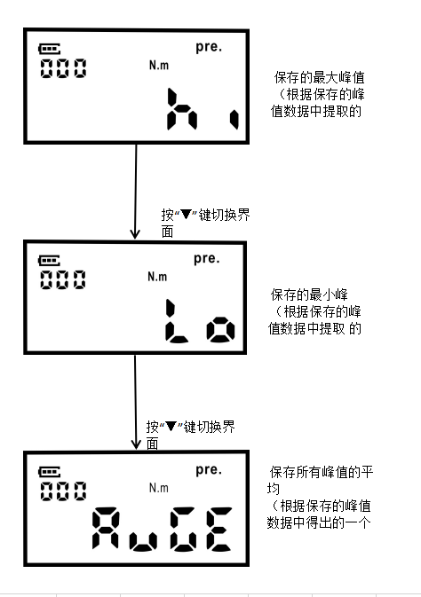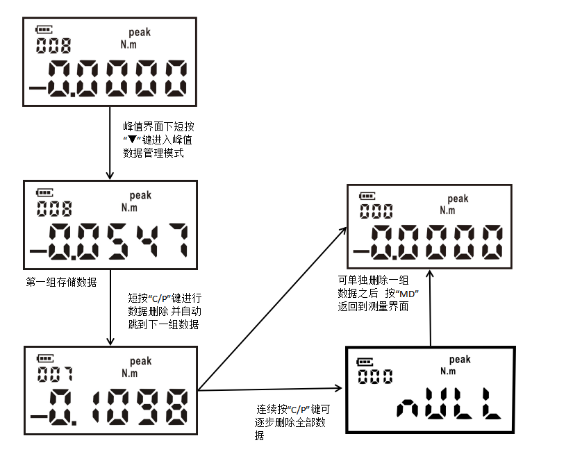 ⑥ 在PEAK(峰值)模式下按向下键,进入峰值数据查看界面,用向下或向上键可以查看每一组数据。P/C键可以删除当前数据。MD键返回peak模式。