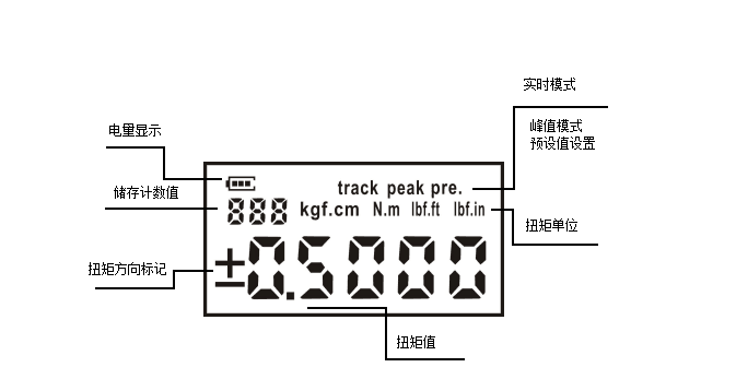 4位半LCD液晶显示器包含电量显示、两种工作模式、预置值设置、扭矩单位、扭矩值、扭矩方向标记、存储计数值。