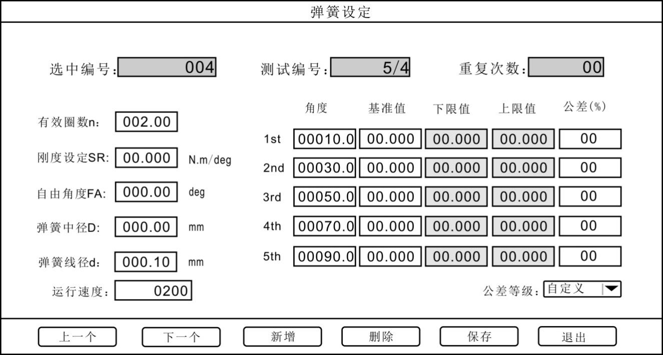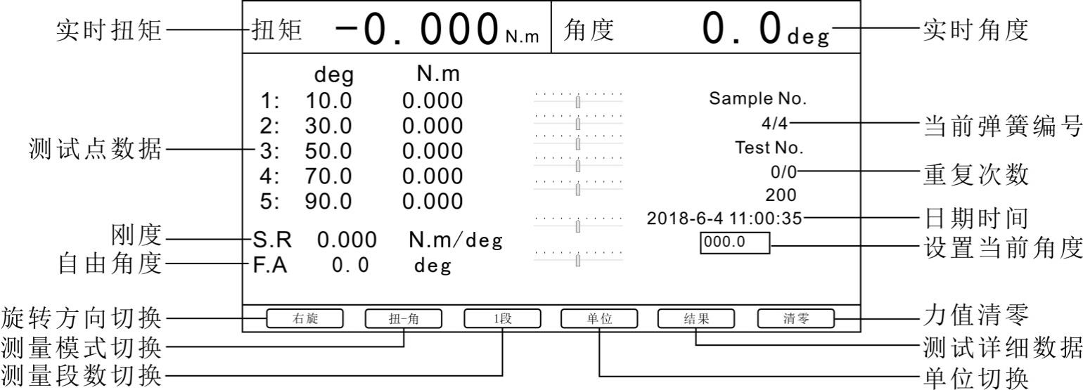 e、测量段数:根据设置的测量段数测试相应的弹簧测试点数,1段就是求第 一个测试点的角度或扭力。