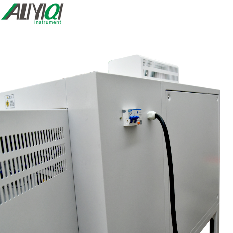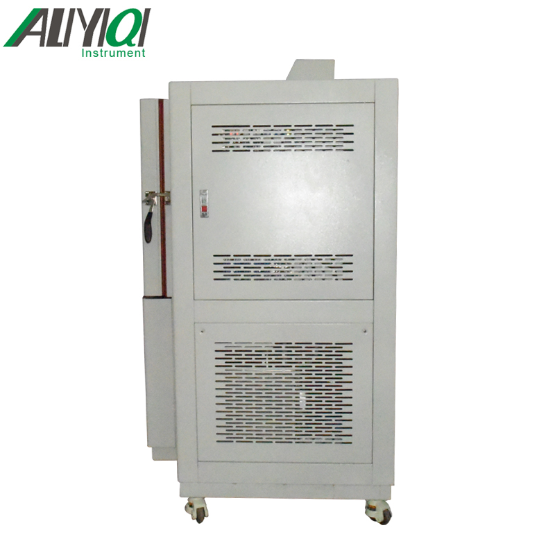 试验箱上部为工作室,右侧为电器控制室;下部为制冷机组,下部右后方小门内装有加湿用储水桶,大门中间安装有导电膜加热玻璃视窗,保证在低温及高湿状态下能有效观察试件状态。