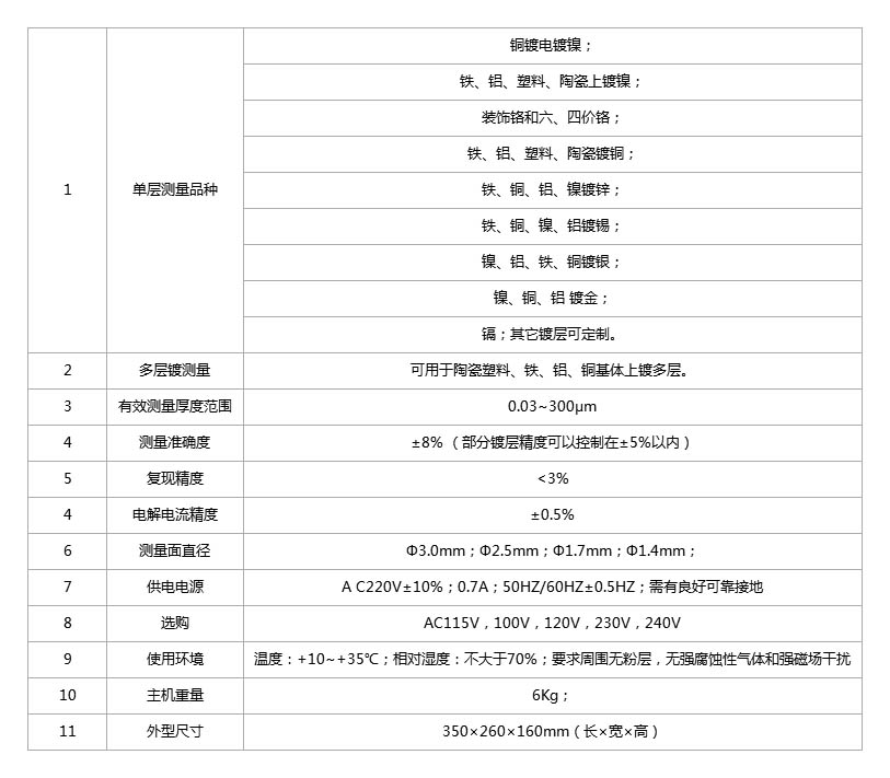 9.以测量70种以上金属镀层基体组合,可以测量平面、曲面上的镀层,可以测量小零件、导线、线状零件;